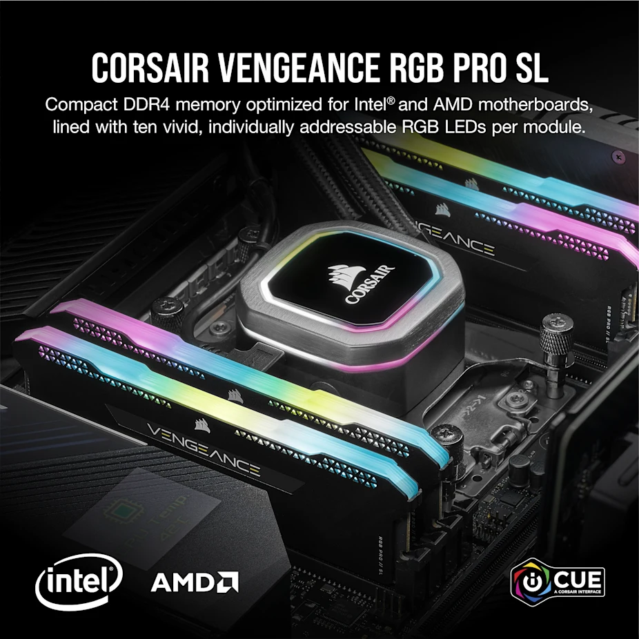 CORSAIR VENGEANCE RGB PRO SL DDR4 memory lights up your PC with dynamic, individually addressable RGB lighting, while delivering peak performance in a compact form factor.